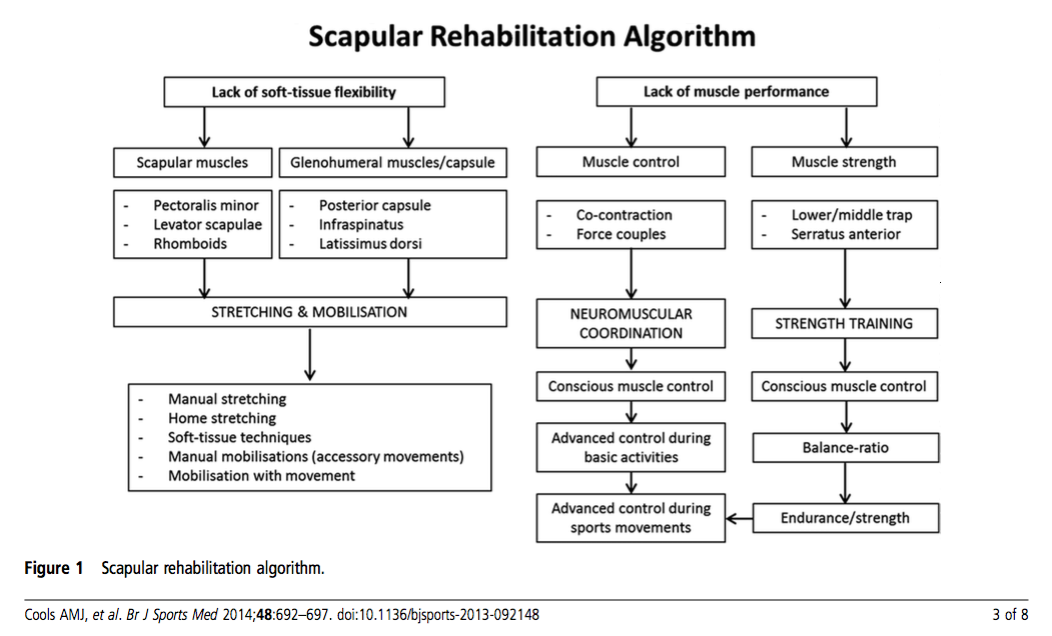 To assist with this clinical reasoning process, Cools et al (2013) presented an algorithm which further explores how scapula rehabilitation can be incorporated into the treatment program and assist with goal setting. The authors emphasise that every patient needs to be assessed individually to determine what factors might be contributing to the problem. It is important to remember that scapula rehabilitation may only be one component of the treatment. Clinicians should also aim to restore cervical and thoracic spine mobility, lower limb kinetic chain strength and dynamic motor control and core stability.