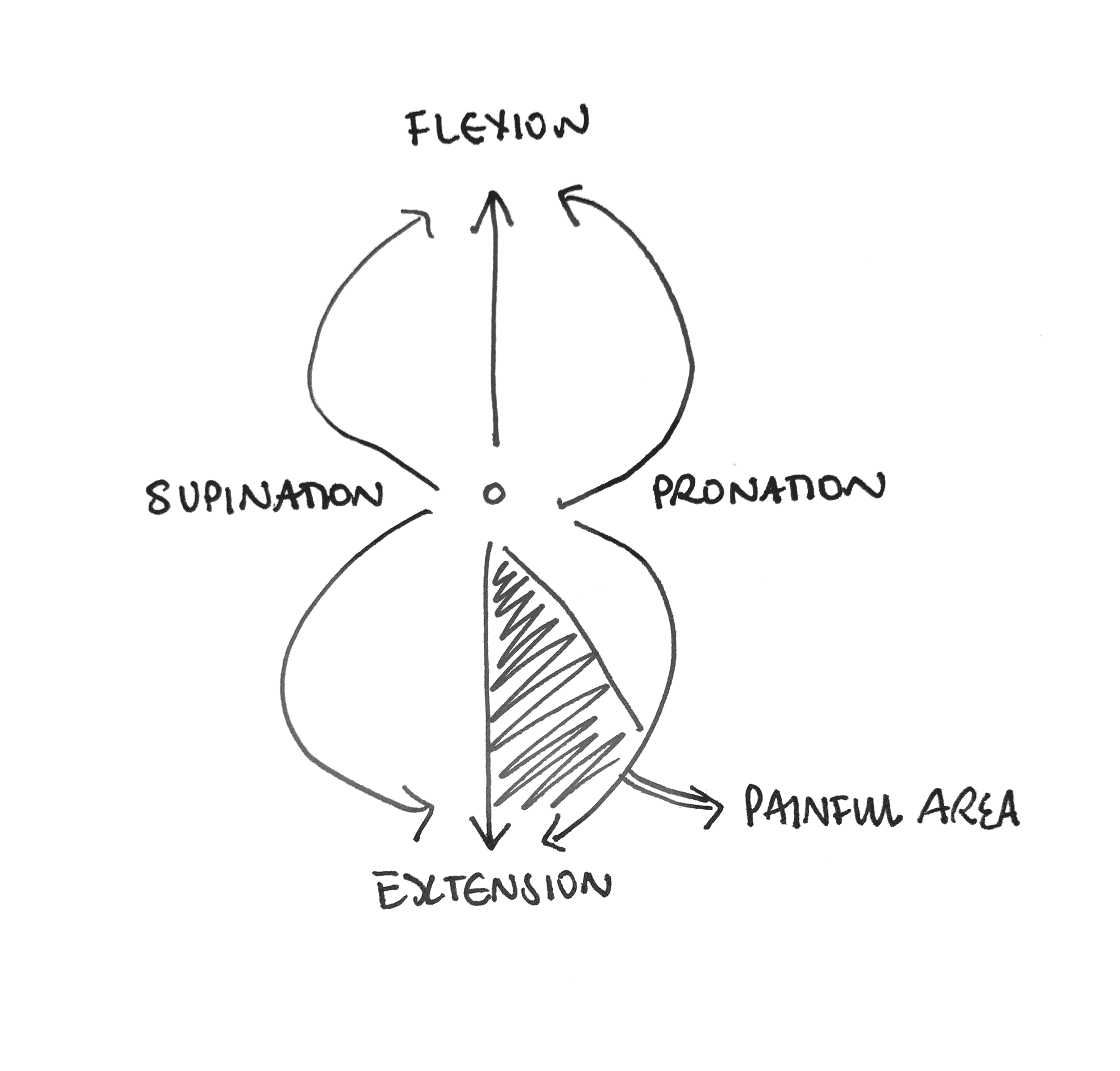For some reason however, maybe because she asked me while I was still holding onto her arm, I decided to show her. This video is captured on an asymptomatic elbow but shows how I move through combined elbow range in my passive movement assessment. What you can see is that even though the elbow joint proper is mostly viewed as a hinge joint, when combined with forearm pronation and supination it has a much larger and circular range available. What I was able to show Mrs. P is that she has full elbow flexion with both pronation and supination, full elbow extension in supination and only a small part of her overall elbow movement was impacted at this stage (combined extension/pronation). Instead of the patient then focussing on the movement that increased her pain, she realized how much unrestricted movement was non-provocative.