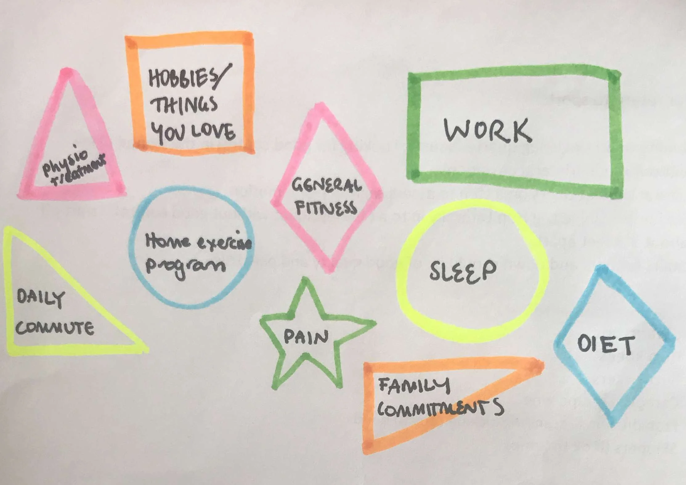 For many people, and for Mrs. P in particular, if you can knock out the bigger shapes and I help with the physical/therapy related shapes, together we work out how to stay under the line and return to normal function in a graded way. Hopefully this explains my theory a little (again this is hard to write down) and I want to emphasize this is merely my visual analogy for helping others realize how much control they have over their own problem. What I use it to explain is: